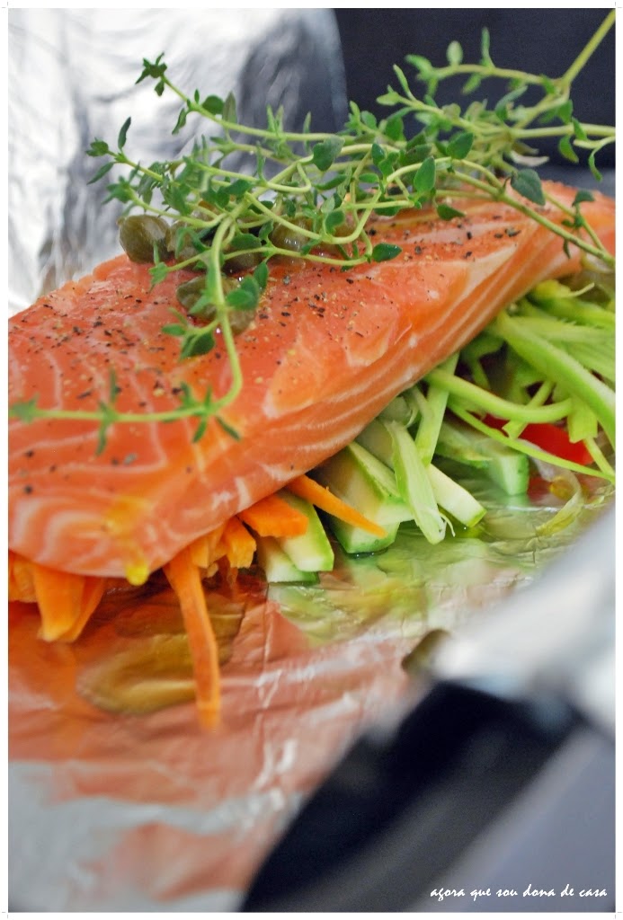peguei um pedaço grande (uns 40 cm) de papel alumínio e reguei com um fio de azeite extra virgem. por cima, dispus os legumes, lado a lado, e temperei com sal e pimenta do reino. coloquei, então, o filé de salmão, salpiquei semente de coentro moídas na hora e um punhado de alcaparras. reguei com mais azeite e finalizei com folhas de tomilho fresco.